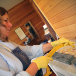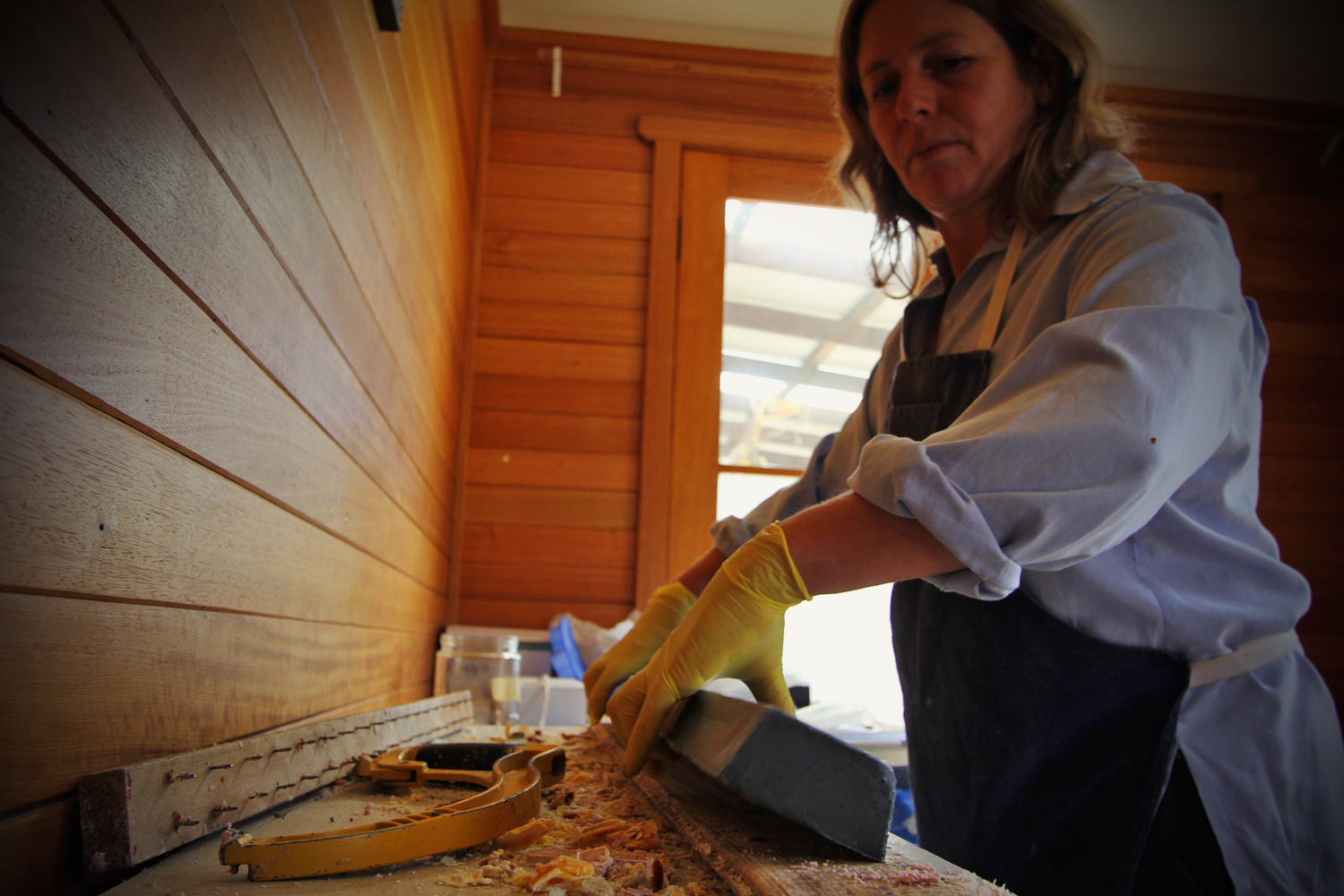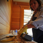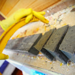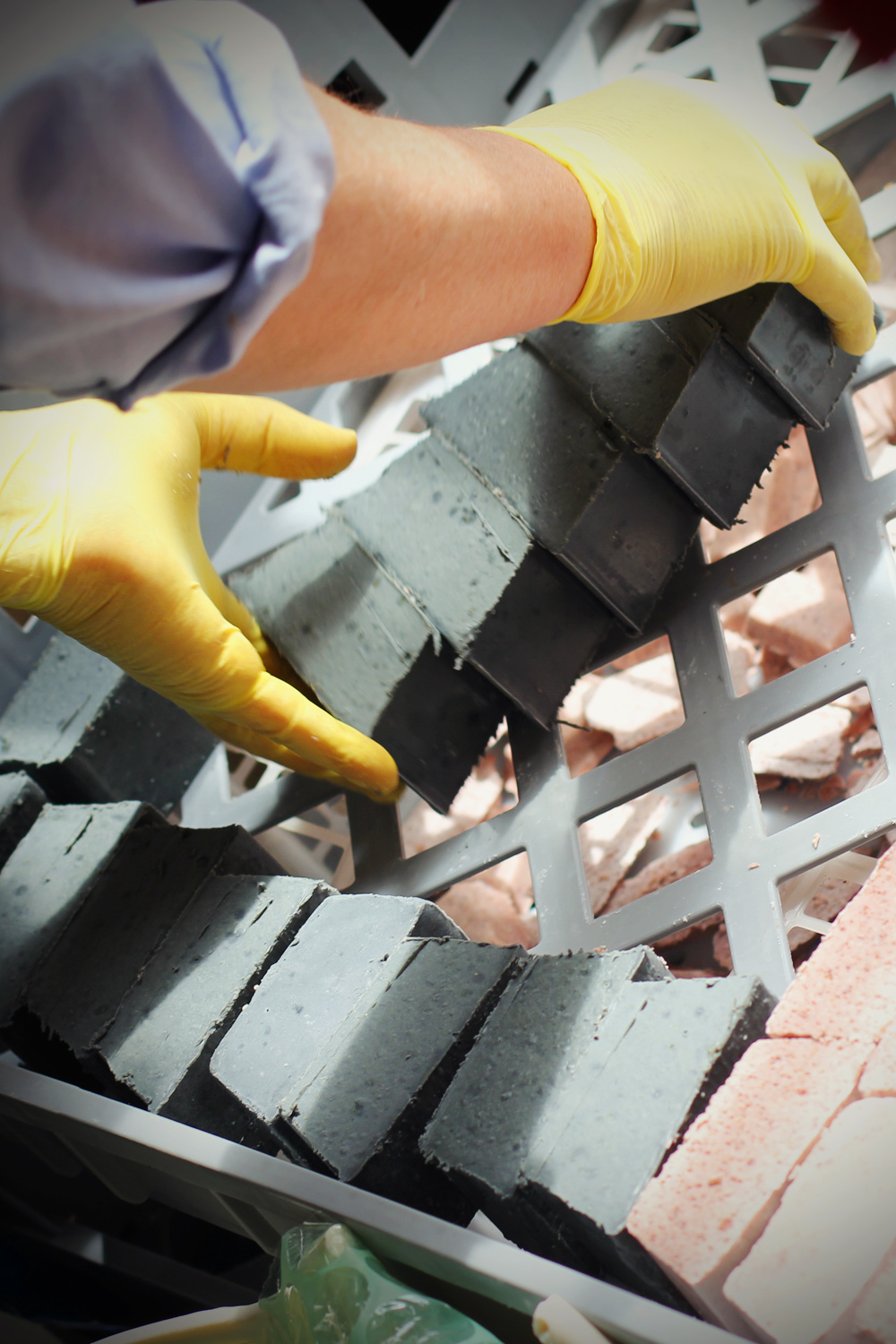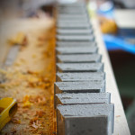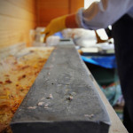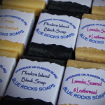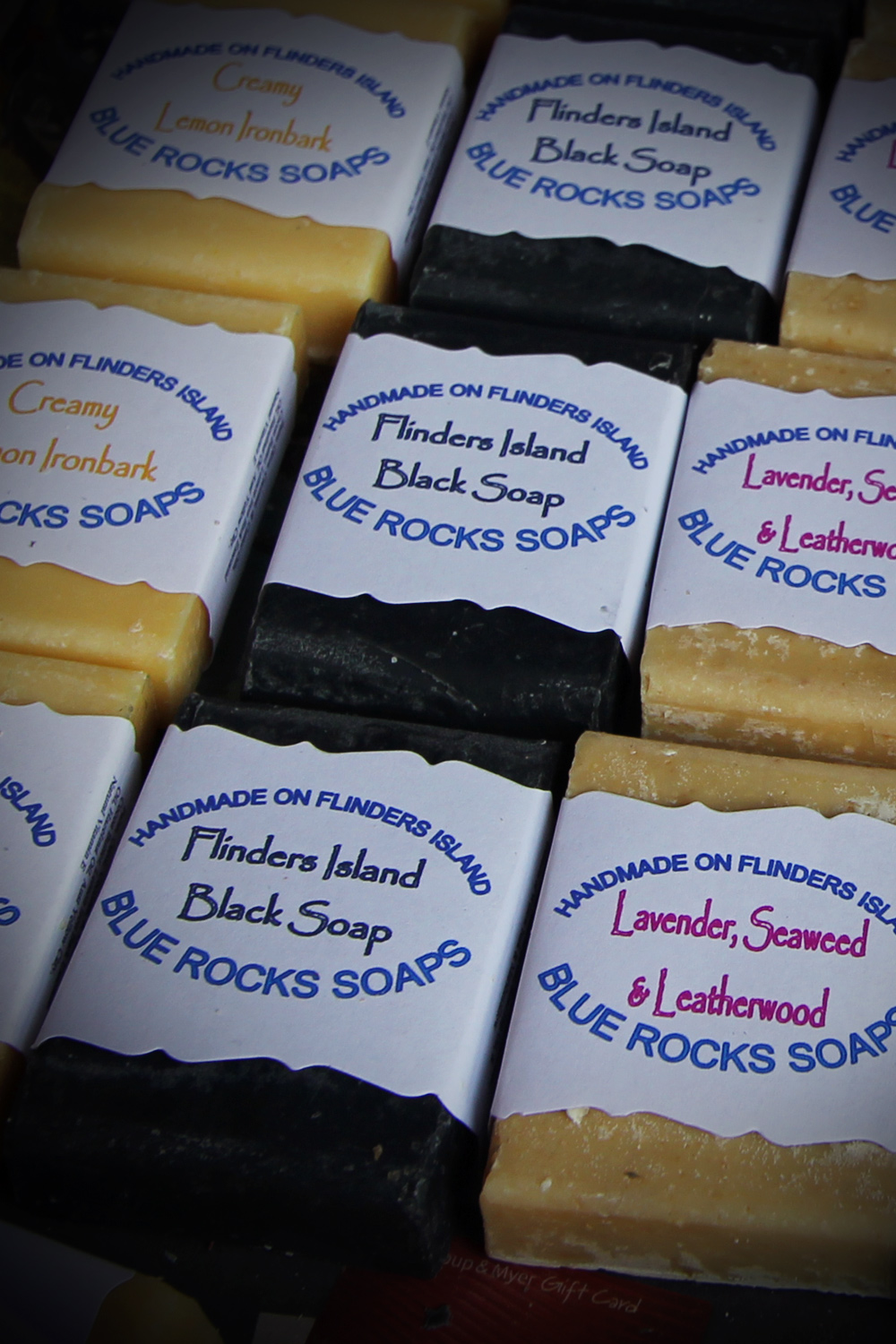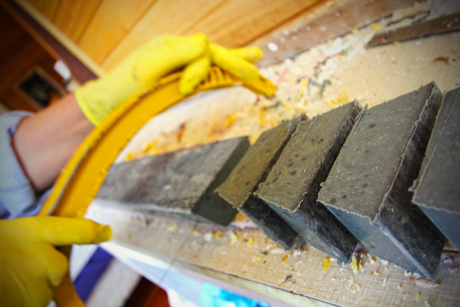 2-3 days after pouring the soap into moulds after it’s firmed up (in between a soft & firm cheese), it’s marked out & sliced with a wire attached to a hacksaw in lieu of a blade then placed on racks to cure for a further 4 weeks minimum. The crumbs & shavings are kept for Soap Pourri with Flinders Island Black soap pictured.